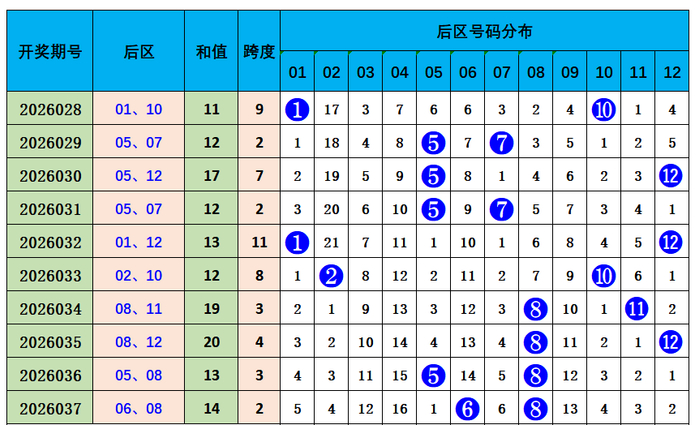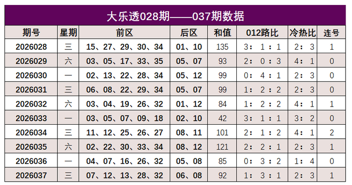 大乐透第2026037期出奖号统计:前区07、12、13、28、32,后区06、08。和值92,012路比1:3:1,冷热比2:3,开出1组连号。